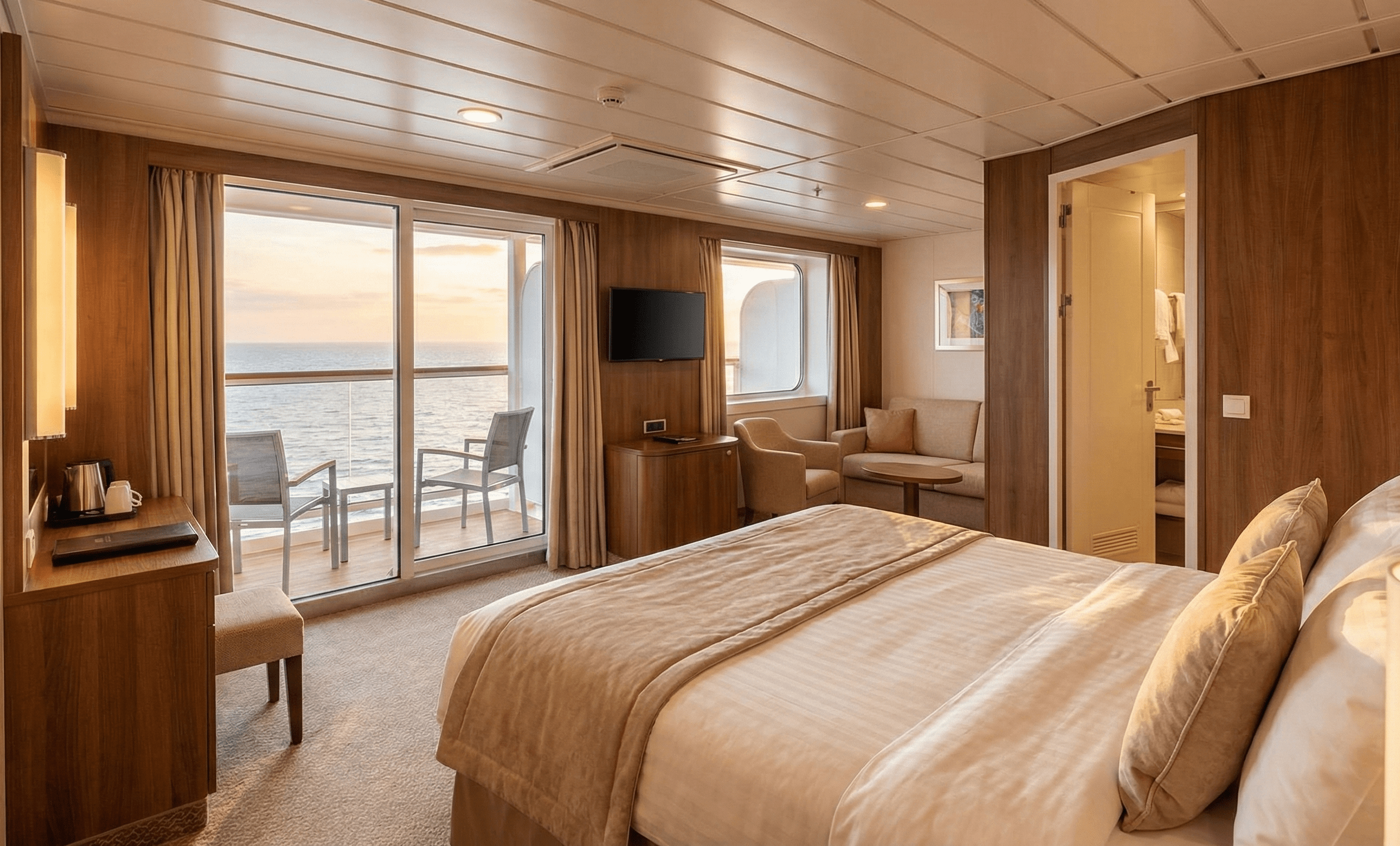 乘坐大洋郵輪蔚藍海岸號體驗20晚的旅程。在282平方英尺的陽台房中放鬆身心,配備Ultra Tranquility Bed、無限暢飲軟性飲料的迷你吧和私人柚木陽台。享受寶格麗洗浴用品、每日兩次客房服務和24小時客房送餐服務。行程從東京出發,途經日本北部,穿越國際換日線前往阿拉斯加的冰川和港口,最後抵達西雅圖。